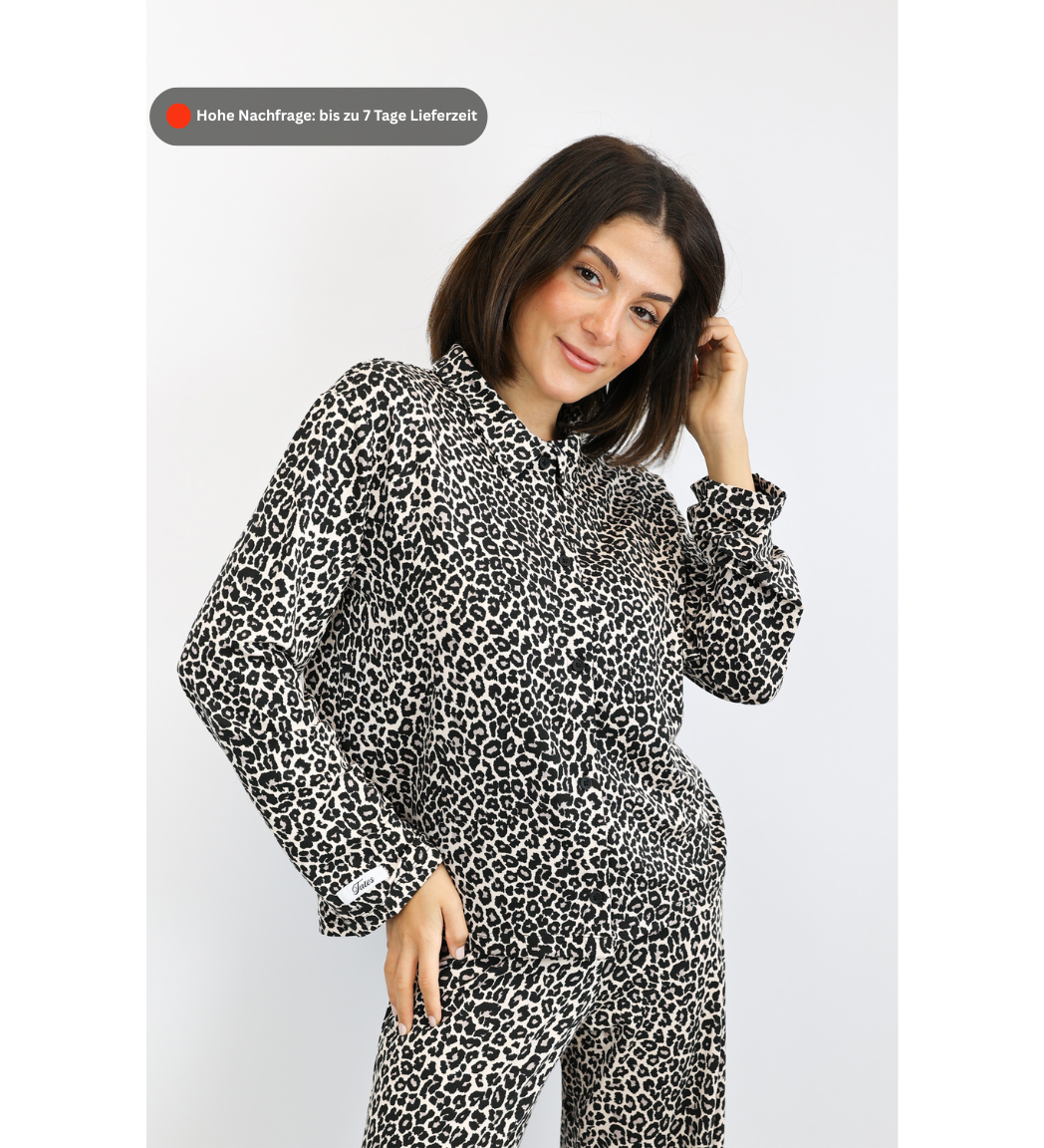 Das Hemd kommt in einem ruhigen, modernen Leoprint. Dezente Logo-Details an Bund und Ärmel runden den Look ab – stilvoll, nicht laut.