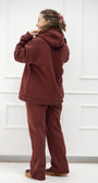 Das Model ist 165cm groß und trägt Größe M (Bordeaux, Flieder und Beige).