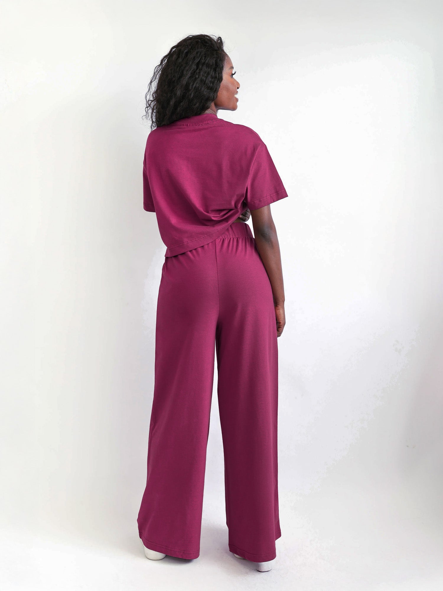 Die Wide Leg Hose ist in drei Farben erhältlich: Berry, Dusty Blue und Schwarz.