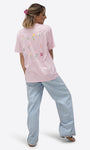 Mit ähnlichen Farben waschen, nicht im Trockner trocknen, Aufdruck nicht bügeln, auf links waschen und bügeln.
