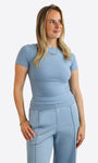Erhältlich ist das Slim T-Shirt in Hellblau, Bubble Pink, Peach, Butter Yellow, Matcha, Dusty Blue, Berry, Rouge, Schwarz und Aubergine erhältlich.